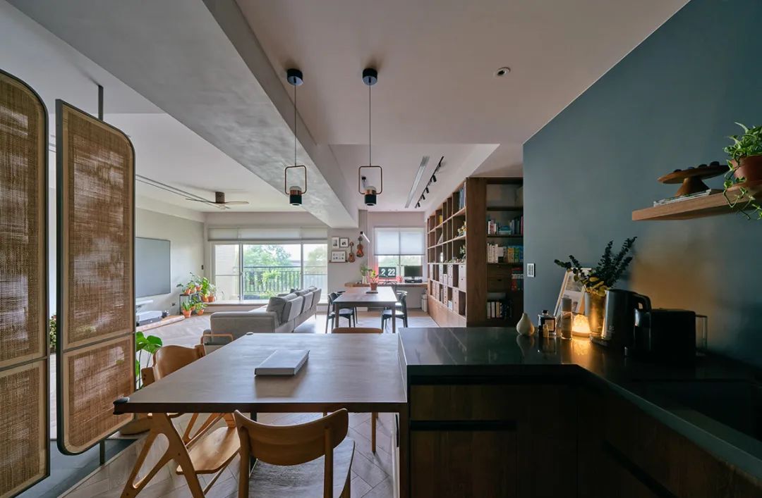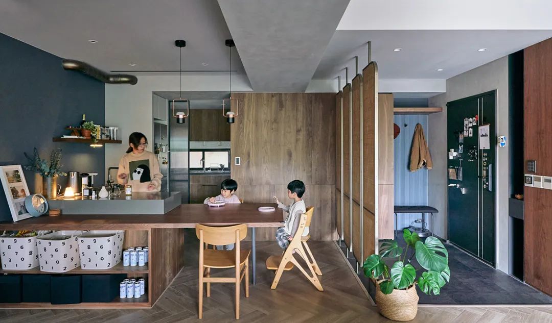 厨房岛台延伸出的西餐区,也是一家人就餐的区域。这里视野也十分开阔,能看清屋里每个角落,平时也方便妈妈时刻关注到孩子。
